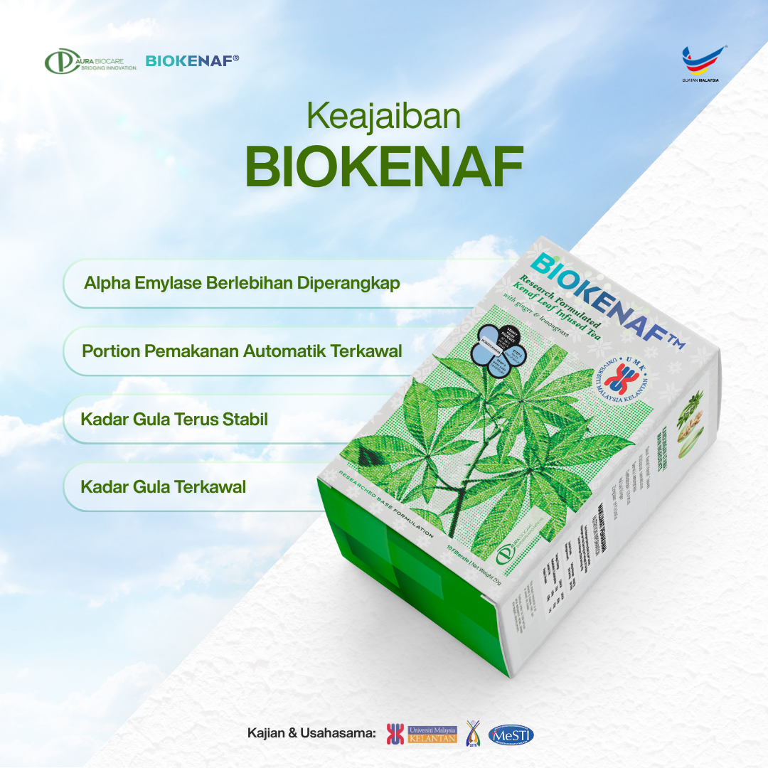 Biokenaf® diformulasi untuk target halang alpha-amylase dari memecahkan karbohidrat kepada gula & hentikan pembentukan lemak & triglycerides di hati.