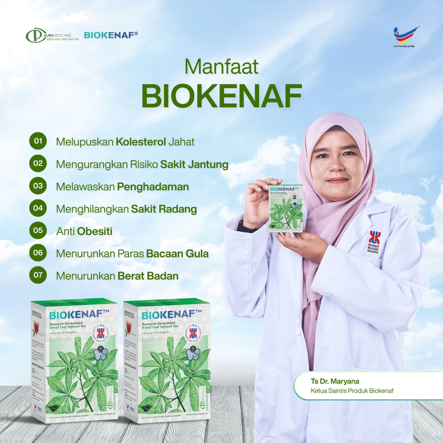 “Sebagai seorang saintis, saya perlu buktikan keberkesanan produk ini, bukan sahaja melalui kajian terperinci, dengan amalkan Biokenaf® saya dapat buktikan penurunan berat & penghapusan kolesterol jahat secara natural.” – Ts. Dr. Maryana Mohd Nor